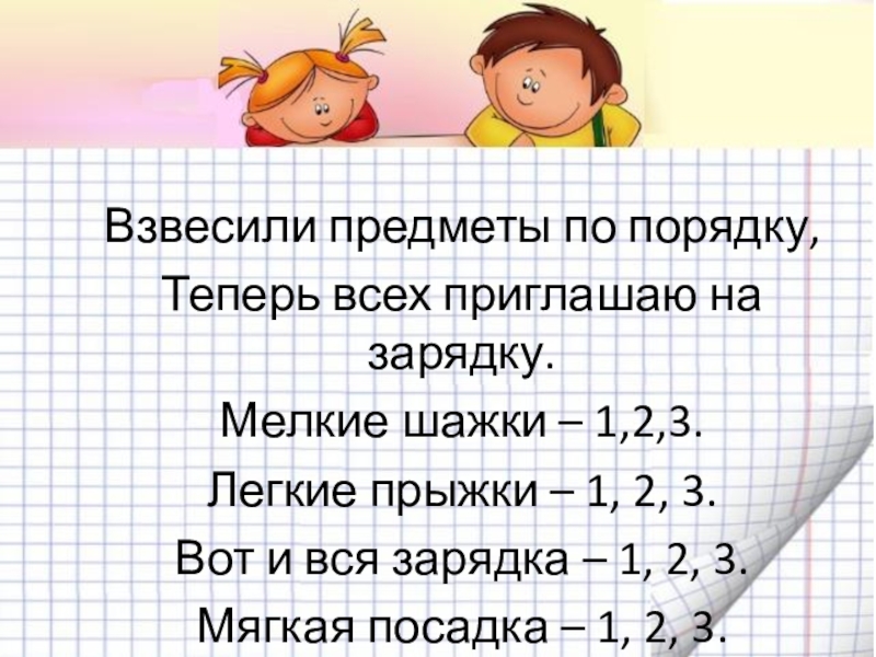 Взвесили предметы по порядку,Теперь всех приглашаю на зарядку.Мелкие шажки – 1,2,3.Легкие прыжки – 1, 2, 3.Вот и