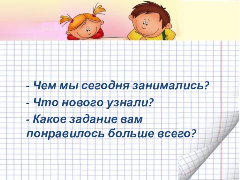 - Чем мы сегодня занимались?- Что нового узнали?- Какое задание вам понравилось больше всего?