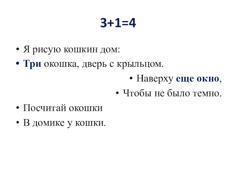 3+1=4Я рисую кошкин дом:Три окошка, дверь с крыльцом.Наверху еще окно,Чтобы не было темно.Посчитай окошкиВ домике у кошки.