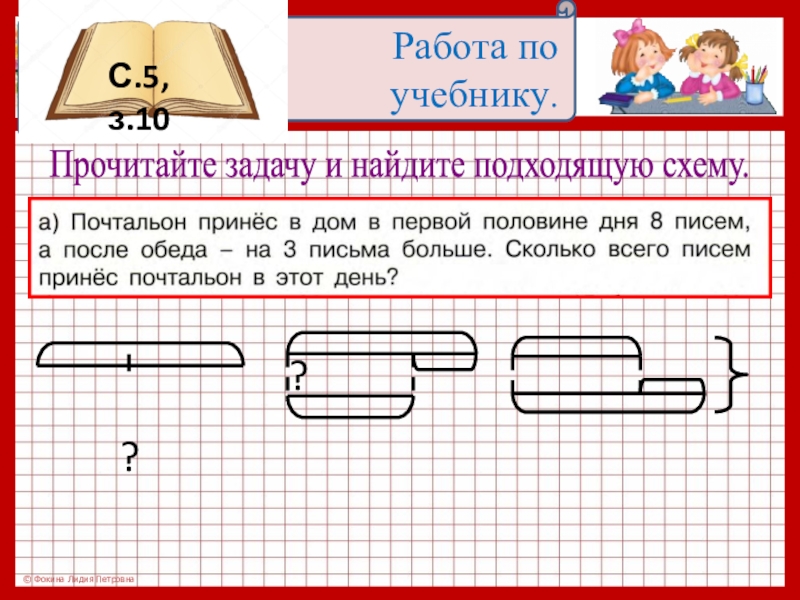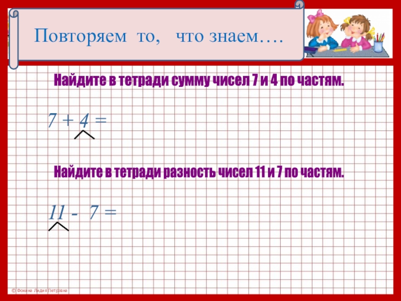 Найдите в тетради сумму чисел 7 и 4 по частям.