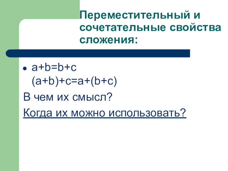 Переместительный и сочетательные свойства сложения:a+b=b+c  (a+b)+c=a+(b+c)В чем их смысл?Когда их можно использовать?