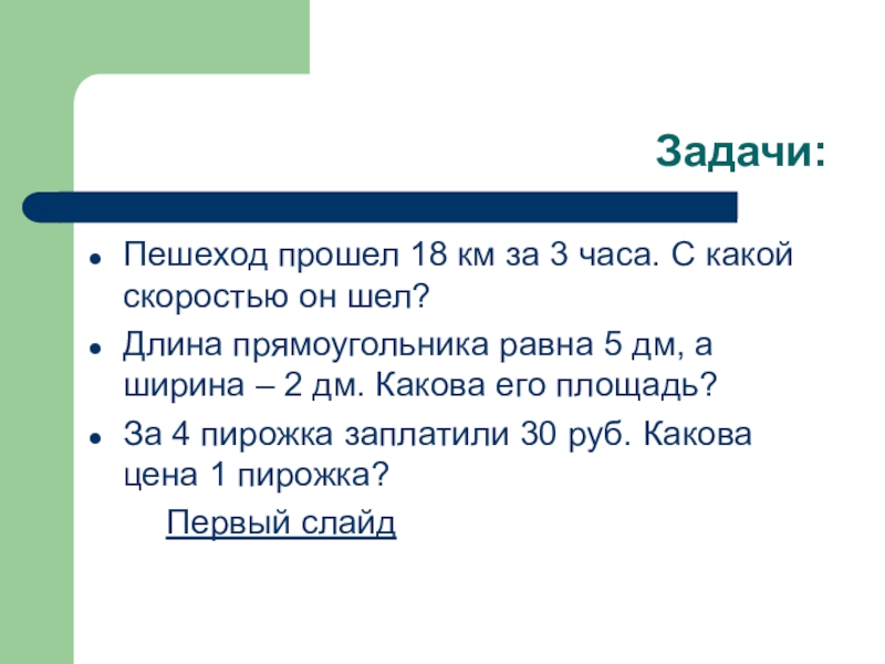 Задачи:Пешеход прошел 18 км за 3 часа. С какой скоростью он шел?Длина прямоугольника равна 5 дм, а
