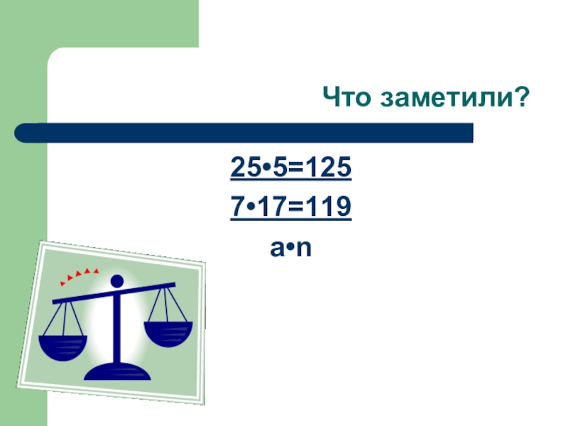 Что заметили?25•5=1257•17=119a•n