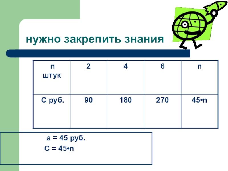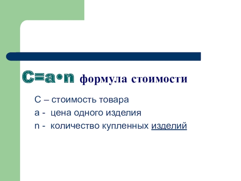 C=a•n формула стоимости  C – стоимость товара  a - цена одного изделия  n -