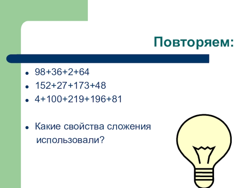 Повторяем:98+36+2+64 152+27+173+484+100+219+196+81Какие свойства сложения использовали?