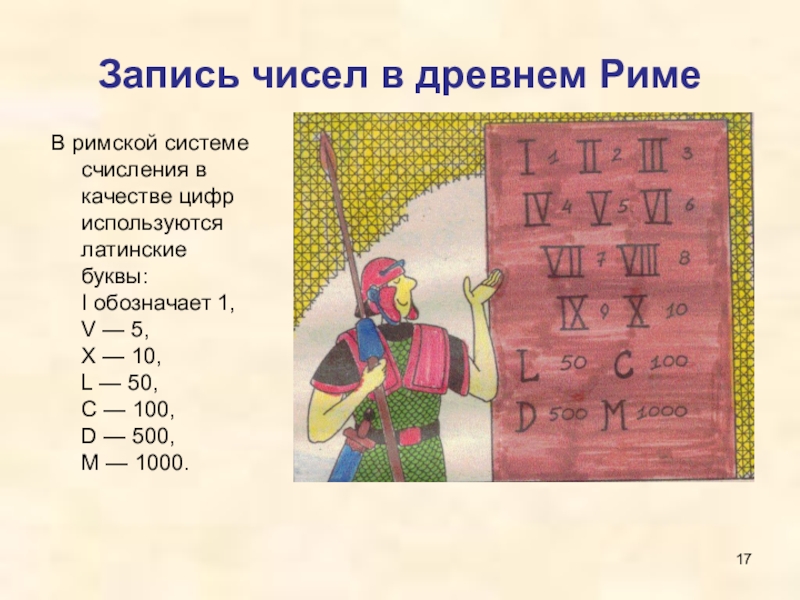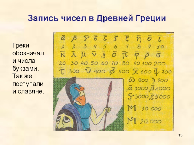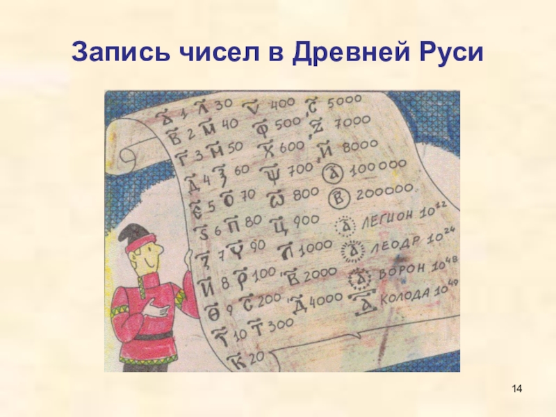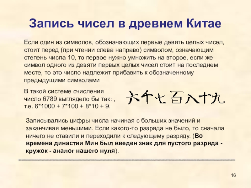 Если один из символов, обозначающих первые девять целых чисел, стоит перед (при чтении слева направо) символом, означающим степень числа 10, то первое нужно умножить на второе, если же символ одного из девяти первых целых чисел стоит на последнем месте, то это число надлежит прибавить к обозначенному предыдущими символами
