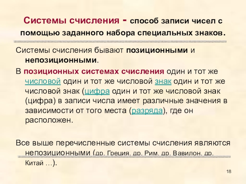 Все выше перечисленные системы счисления являются непозиционными (др. Греция, др. Рим, др. Вавилон, др. Китай …).