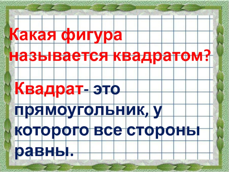 Какая фигура называется квадратом?Квадрат- это прямоугольник, у которого все стороны равны.