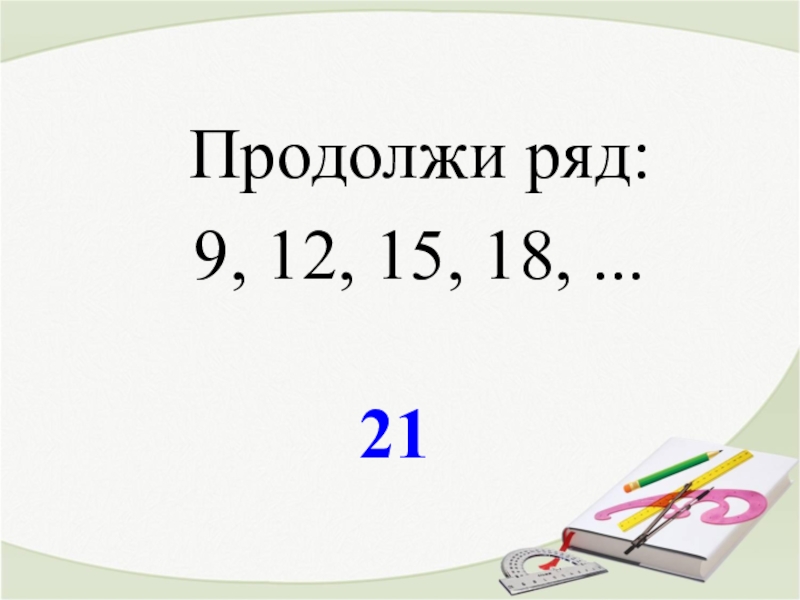 21Продолжи ряд:    9, 12, 15, 18, ...