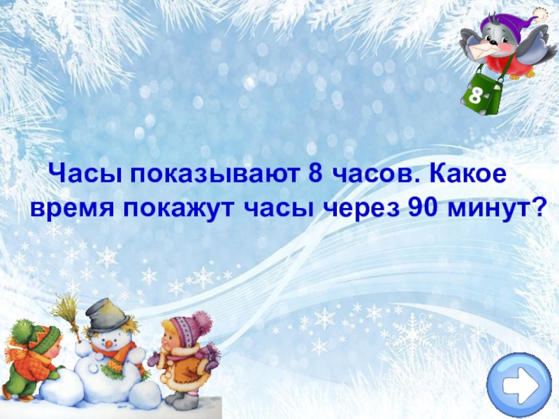 Слайд 9Часы показывают 8 часов. Какое время покажут часы через 90 минут?