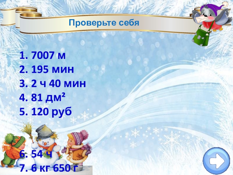7007 м195 мин2 ч 40 мин81 дм²120 руб54 ч6 кг 650 г9ч 30 мин105000 кг5 км