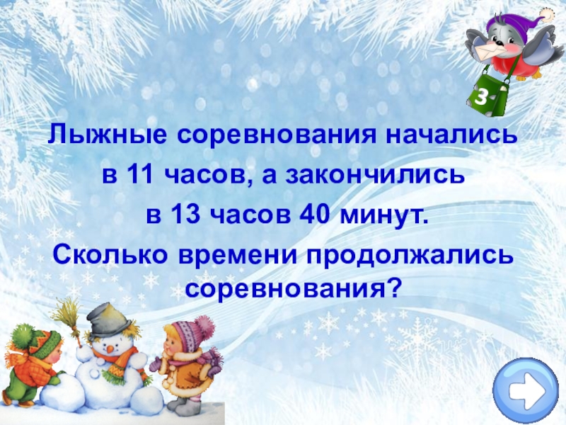 Лыжные соревнования начались в 11 часов, а закончились в 13 часов 40 минут. Сколько времени продолжались соревнования?