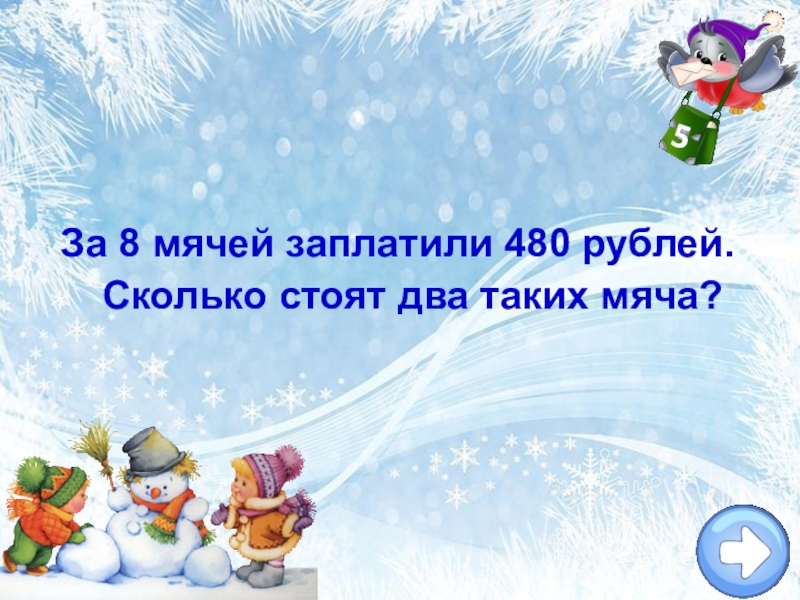 Слайд 6За 8 мячей заплатили 480 рублей. Сколько стоят два таких мяча?
