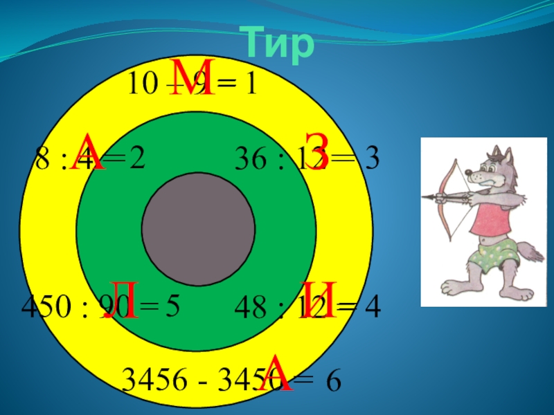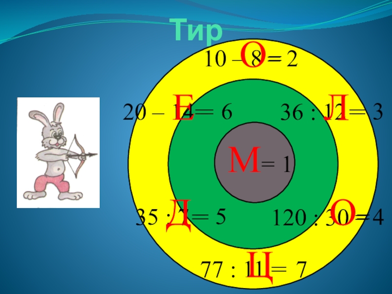 Тир10 – 8 = 2 О=36 : 12 = 3 Л=120 : 30 = 4 О=77 :