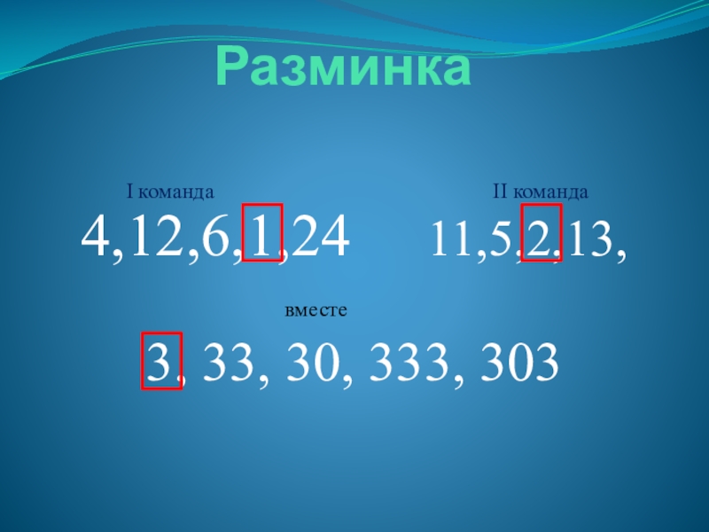 Разминка I команда II команда 4,12,6,1,24 11,5,2,13,