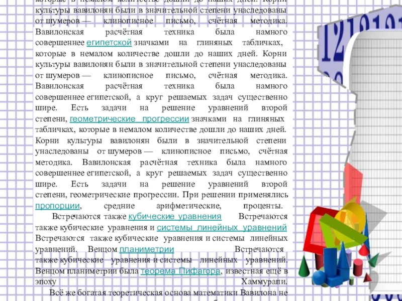 Встречаются также кубические уравнения Встречаются также кубические уравнения и системы линейных уравнений Встречаются также кубические уравнения и системы линейных уравнений. Венцом планиметрии Встречаются также кубические уравнения и системы линейных уравнений. Венцом планиметрии была теорема Пифагора, известная ещё в эпоху Хаммурапи.