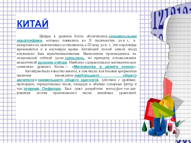 появились во II тысячелетии до н. э., и начертание их окончательно установилось к III веку до н. э. Эти иероглифы применяются и в настоящее время. Китайский способ записи чисел изначально был мультипликативным. Вычисления производились на специальной счётной доске суаньпань, по принципу использования аналогичной русским счётам. Наиболее содержательное математическое сочинение древнего Китая — «Математика в девяти книгах».