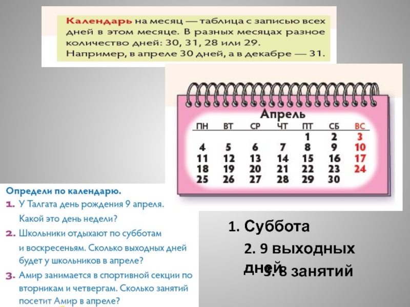1. Суббота2. 9 выходных дней3. 8 занятий