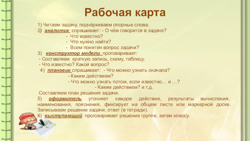 4) оформитель – записывает решение задачи