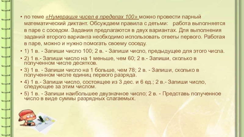 Слайд 9по теме «Нумерация чисел в пределах 100» можно провести парный математический