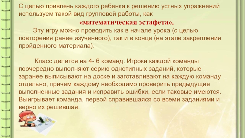 Класс делится на 4- 6 команд. Игроки каждой команды поочередно выполняют серию однотипных заданий, которые заранее выписывают на доске и заготавливают на каждую команду отдельно, причем каждому необходимо проверить предыдущие выполненные задания и исправить ошибки, если таковые имеются. Выигрывает команда, первой справившаяся со всеми заданиями и верно их решившая.