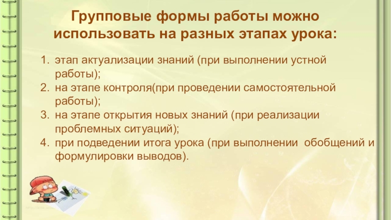 Слайд 7Групповые формы работы можно использовать на разных этапах урока: