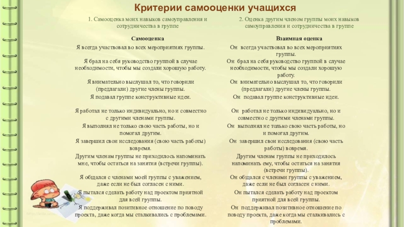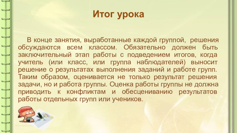 всем классом. Обязательно должен быть заключительный этап работы с подведением итогов, когда учитель (или класс, или группа наблюдателей) выносит решение о результатах выполнения заданий и работе групп. Таким образом, оценивается не только результат решения задачи, но и работа группы. Оценка работы группы не должна приводить к конфликтам и обесцениванию результатов работы отдельных групп или учеников.