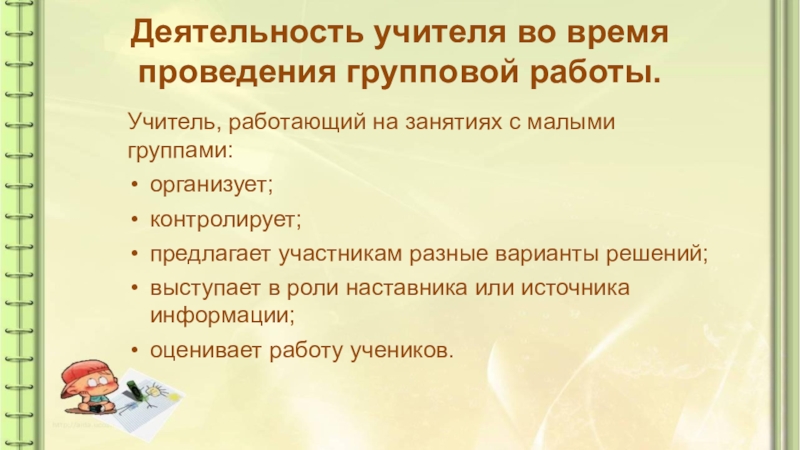 Слайд 4Деятельность учителя во время проведения групповой работы.