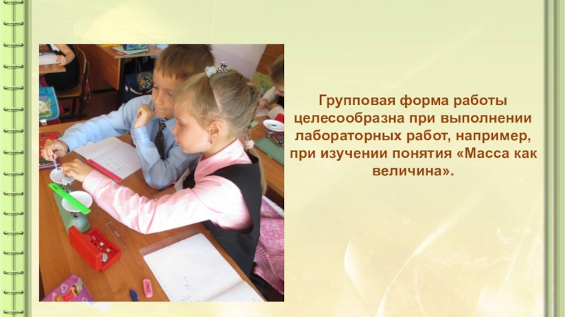 Слайд 17Групповая форма работы целесообразна при выполнении лабораторных работ, например, при изучении