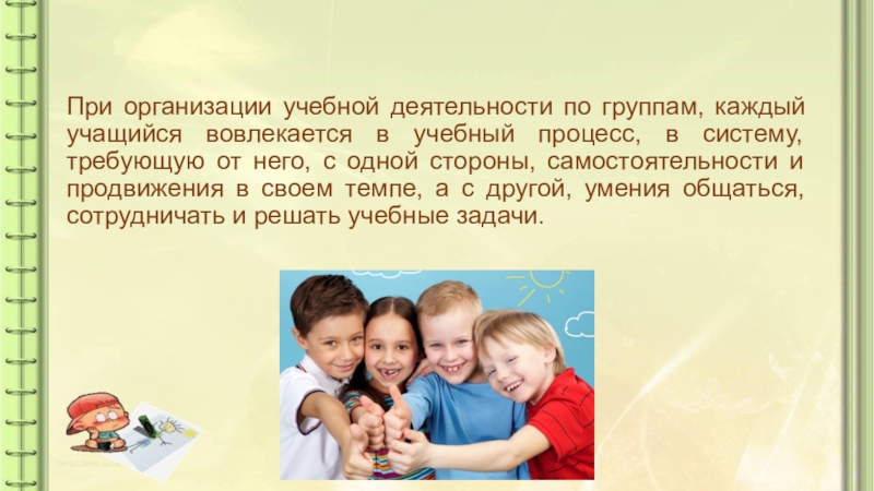 Слайд 25При организации учебной деятельности по группам, каждый учащийся вовлекается в учебный