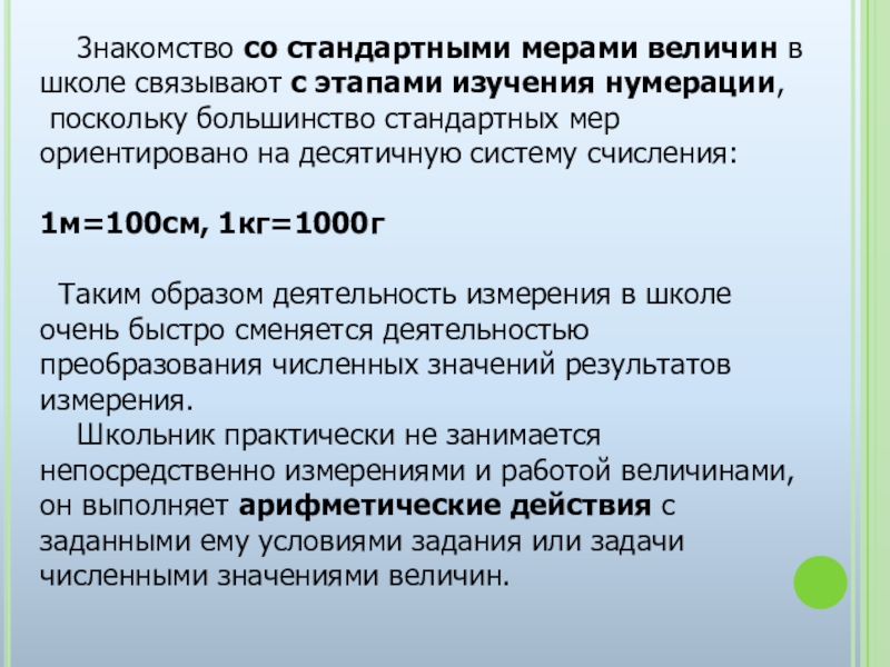 Слайд 8 3накомство со стандартными мерами величин в школе связывают с