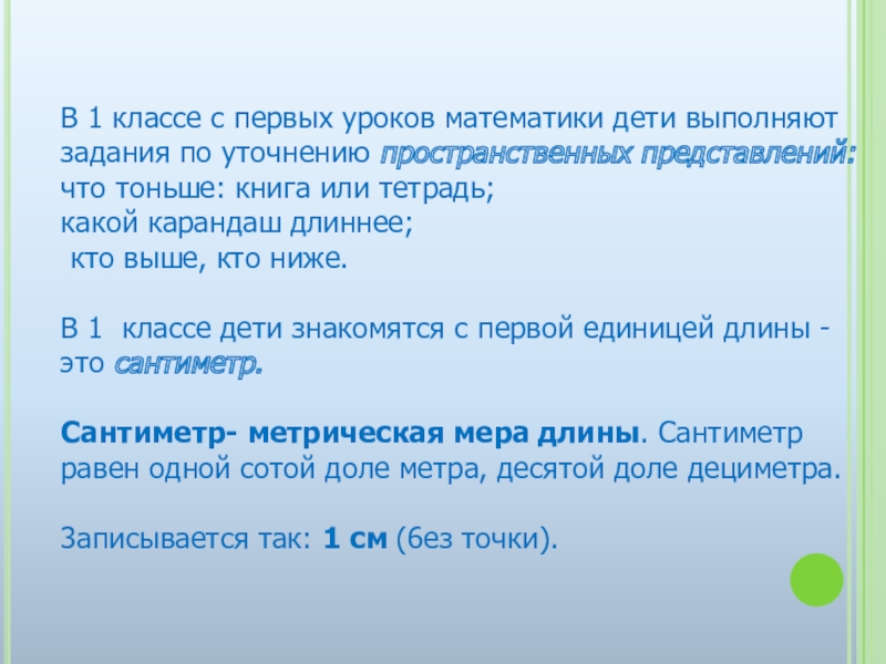 Слайд 12В 1 классе дети получают наглядное представление о сантиметре.