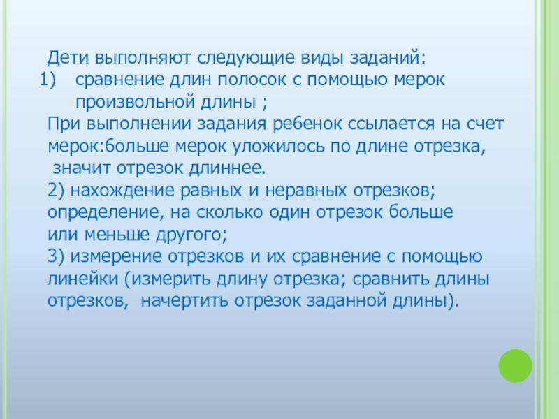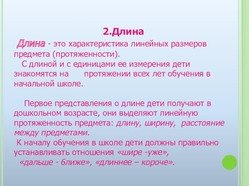 Первое представления о длине дети получают в дошкольном возрасте, они выделяют линейную