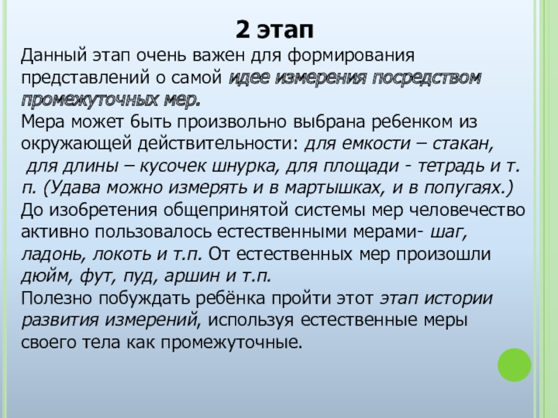 Полезно побуждать ребёнка пройти этот этап истории развития измерений, используя естественные меры