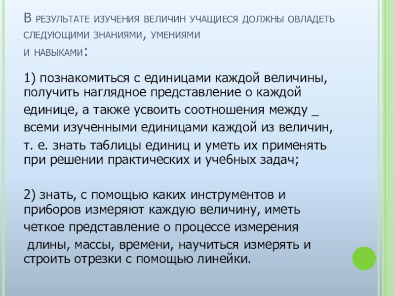 Слайд 9В результате изучения величин учащиеся должны овладеть следующими знаниями, умениями