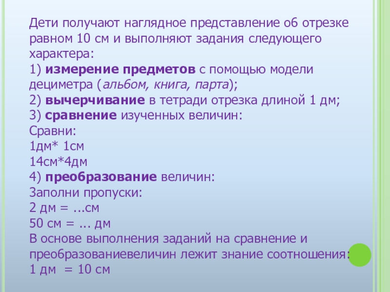 2) вычерчивание в тетради отрезка длиной 1 дм;