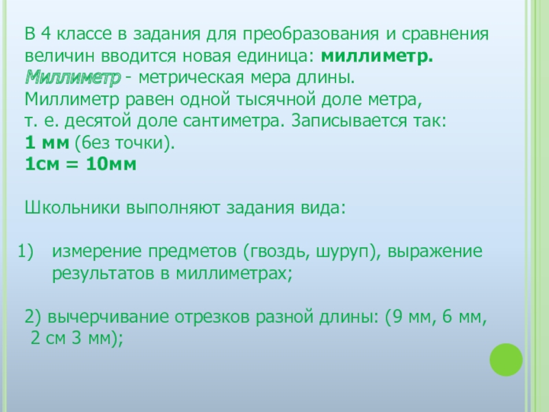измерение предметов (гвоздь, шуруп), выражение результатов в миллиметрах;