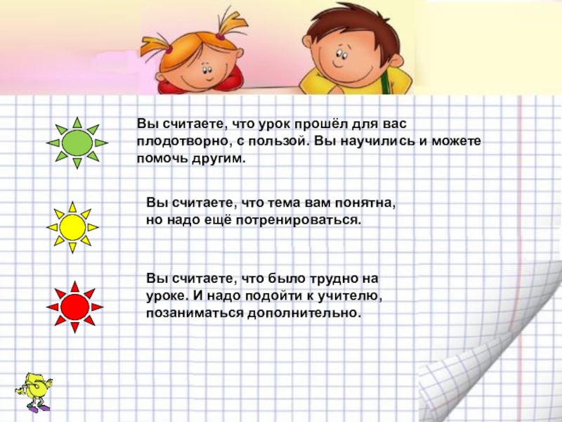 Вы считаете, что урок прошёл для вас плодотворно, с пользой. Вы научились и можете помочь другим.
