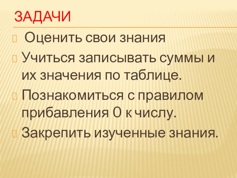 ЗАДАЧИ Оценить свои знанияУчиться записывать суммы и их значения по таблице. Познакомиться с правилом прибавления 0 к