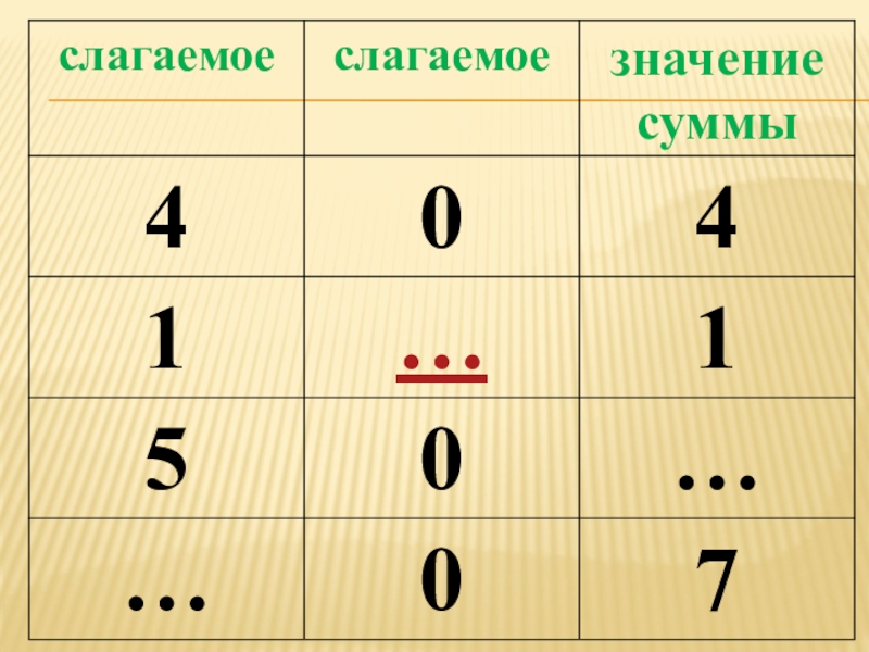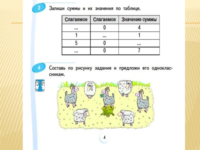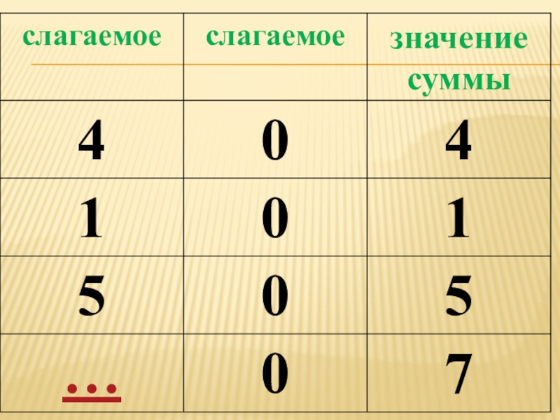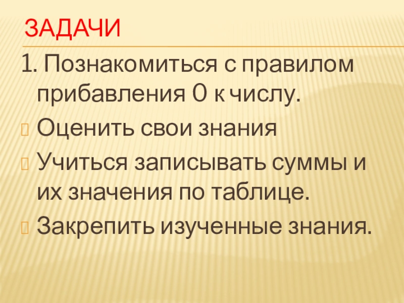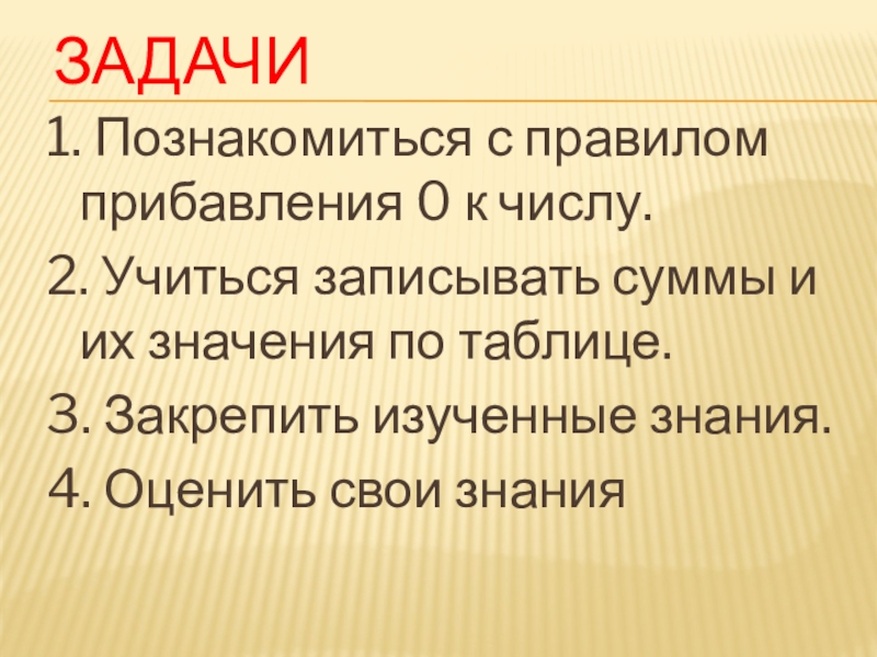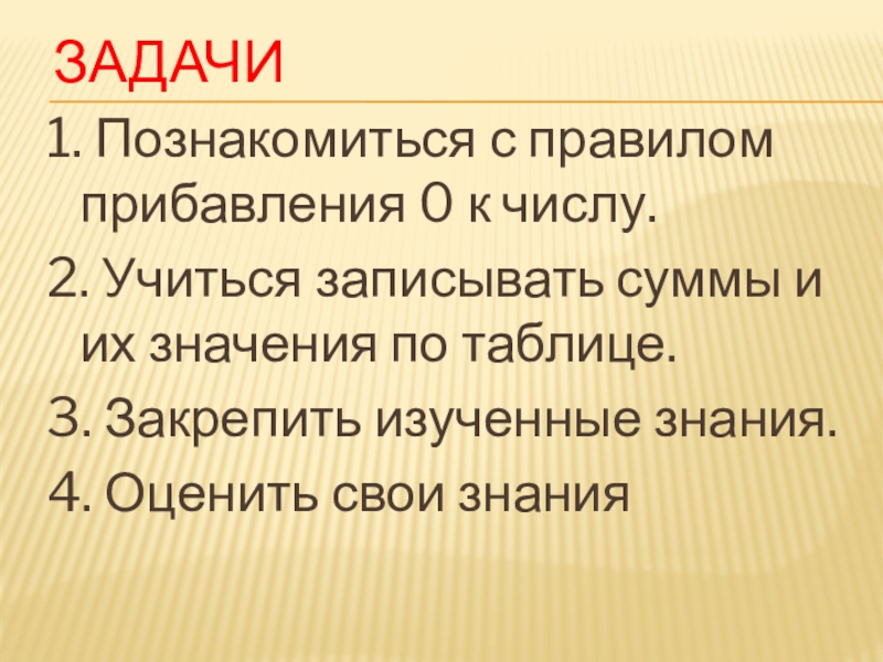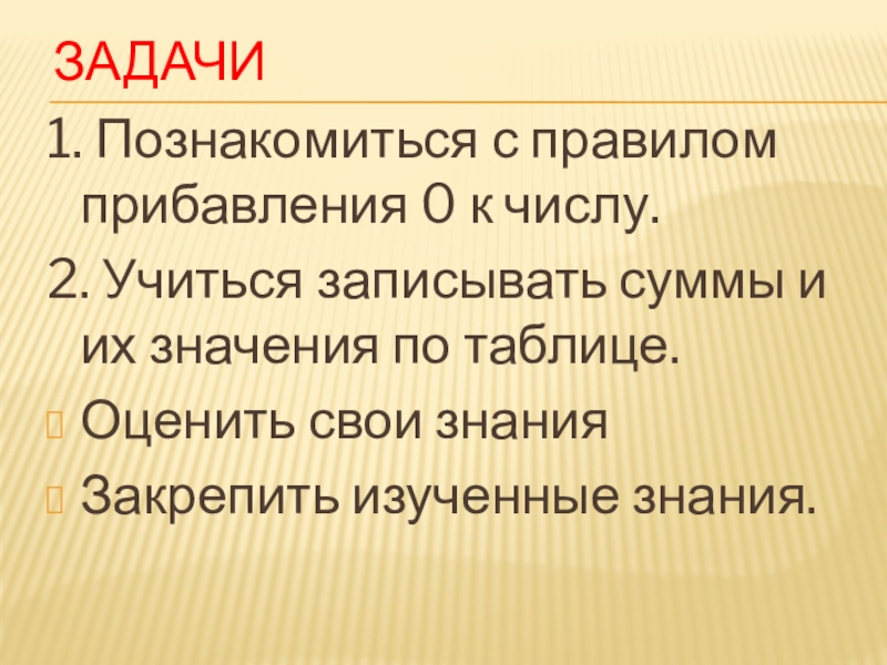 ЗАДАЧИ1. Познакомиться с правилом прибавления 0 к числу.2. Учиться записывать суммы и их значения по таблице. Оценить