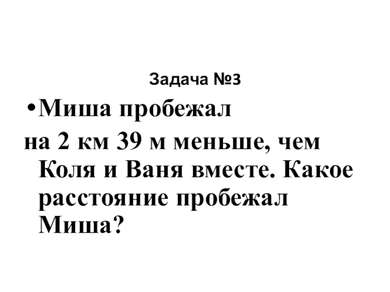 Задача №3Миша пробежал на 2 км 39 м меньше, чем Коля и Ваня вместе. Какое расстояние пробежал