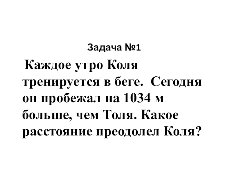 Задача №1  Каждое утро Коля тренируется в беге. Сегодня он пробежал на 1034 м больше, чем