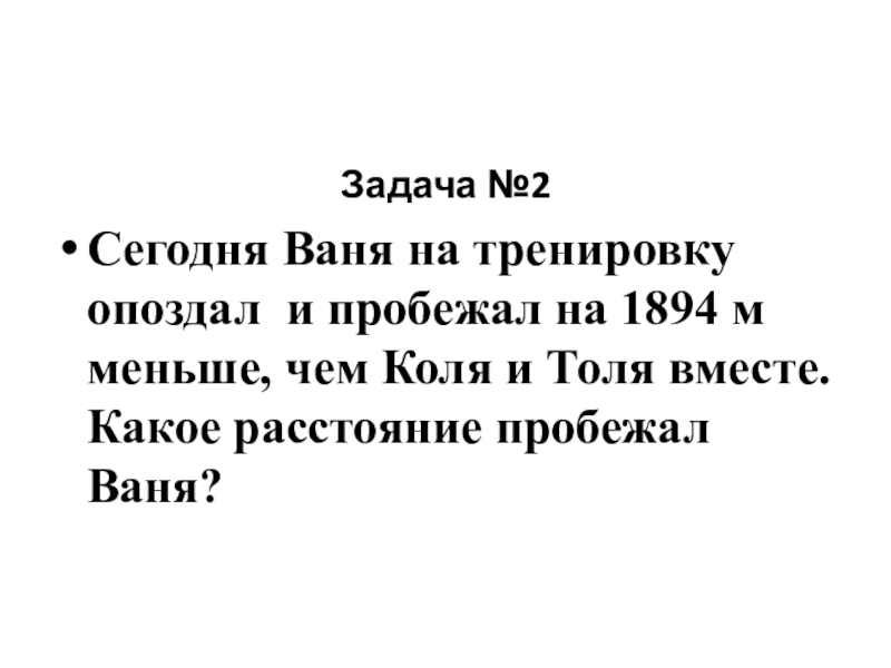 Задача №2Сегодня Ваня на тренировку опоздал и пробежал на 1894 м меньше, чем Коля и Толя вместе.