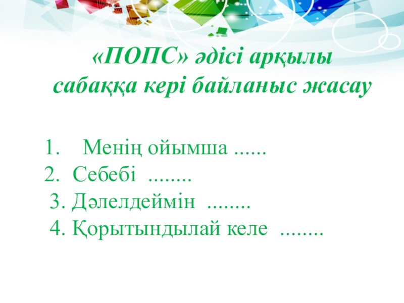 «ПОПС» әдісі арқылы сабаққа кері байланыс жасауМенің ойымша ......Себебі ........3. Дәлелдеймін ........4. Қорытындылай келе ........