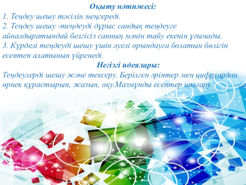 1. Теңдеу шешу тәсілін меңгереді. 2. Теңдеу шешу -теңдеуді дұрыс