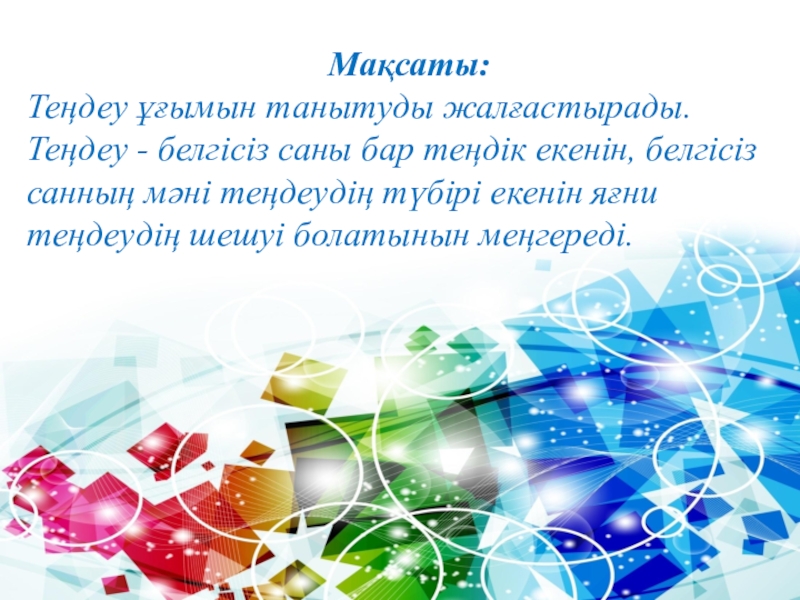 Мақсаты:Теңдеу ұғымын танытуды жалғастырады. Теңдеу - белгісіз саны бар теңдік екенін, белгісіз санның мәні теңдеудің түбірі екенін