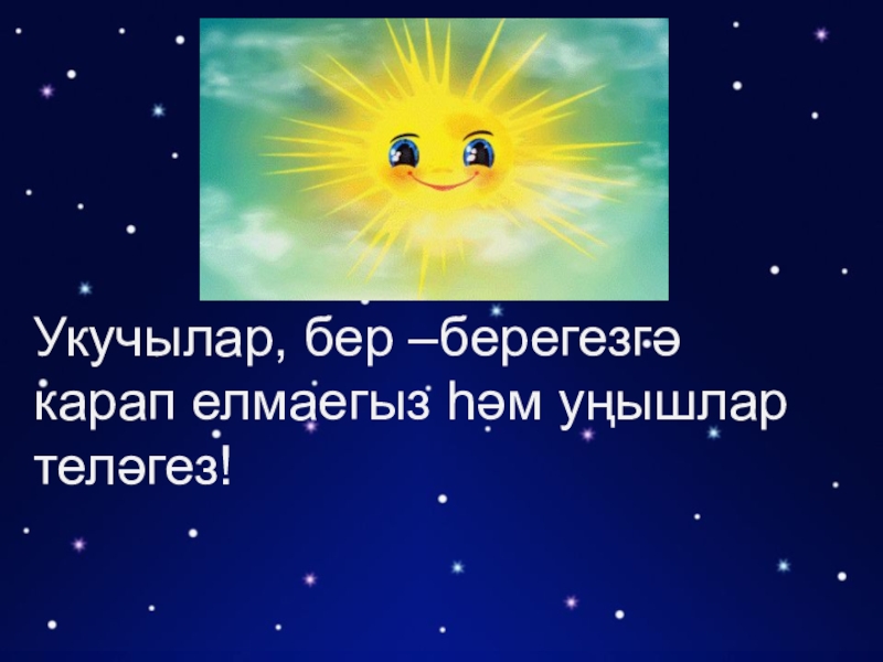 Слайд 2Укучылар, бер –берегезгә карап елмаегыз һәм уңышлар теләгез!