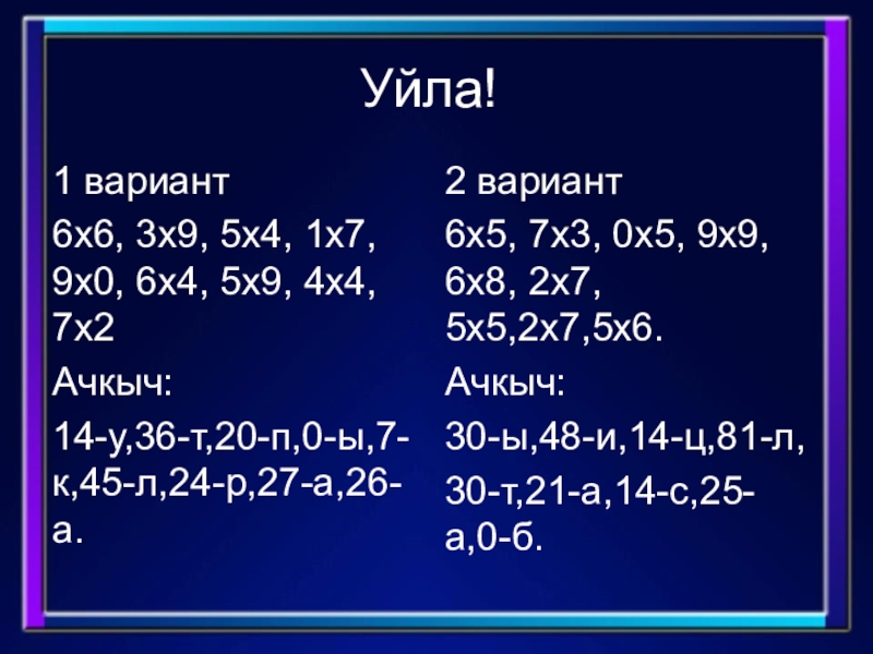 Уйла!1 вариант6x6, 3x9, 5x4, 1x7, 9x0, 6x4, 5x9, 4x4, 7x2Ачкыч:14-у,36-т,20-п,0-ы,7-к,45-л,24-р,27-а,26-а.2 вариант6x5, 7x3, 0x5, 9x9, 6x8, 2x7, 5x5,2х7,5х6.Ачкыч:30-ы,48-и,14-ц,81-л,30-т,21-а,14-с,25-а,0-б.
