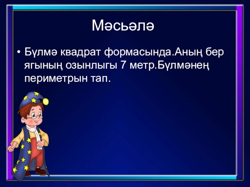 МәсьәләБүлмә квадрат формасында.Аның бер ягының озынлыгы 7 метр.Бүлмәнең периметрын тап.