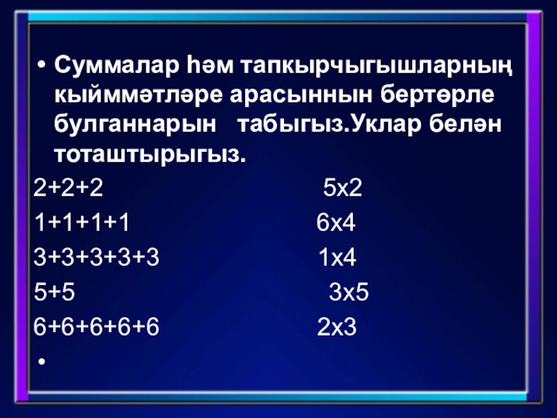 Слайд 7Суммалар һәм тапкырчыгышларның кыйммәтләре арасыннын бертөрле булганнарын табыгыз.Уклар белән тоташтырыгыз.